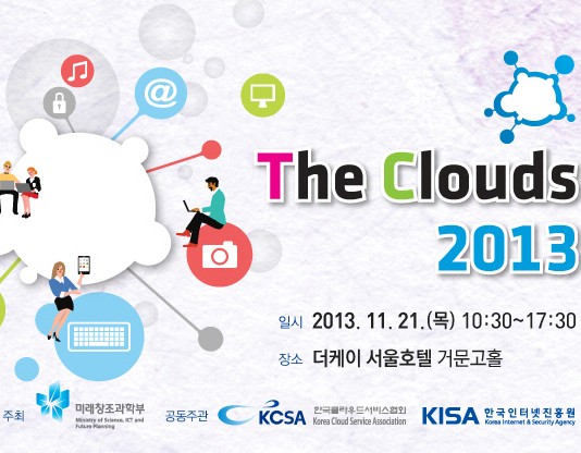 미래창조과학부는 한국인터넷진흥원 및 한국클라우드서비스협회와 함께 11.20(수)∼11.21(목) 양일간 더케이서울호텔 거문고홀에서 ‘클라우드 서비스의 미래와 창조’라는 주제로 ‘The Clouds 2013’을 개최한다.‘The Clouds’는 2008년 개최 이후 올해로 6회째를 맞이하는 국내 대표적 클라우드 콘퍼런스로서, 총 3,200명(누적) 이상의 클라우드 산·학·연 전문가가 참여하여 국내 클라우드 산업 활성화 및 협업생태계 조성을 위한 소통의 장으로 역할 수행...