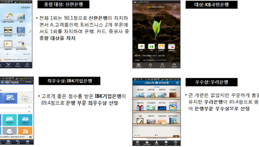 '2013 SM-스마트 앱 대상' 발표스마트폰 가입자 수가 3,500만명을 넘어섰고 수백만 개의 스마트폰 애플케이션(앱)이 개발되어 사용되고 있는 가운데 스마트폰을 이용하는 금융 앱들을 종합적으로 평가한 결과가 벌표돼 관심을 모으고 있다.웹발전연구소(대표이사 문형남 숙명여대 교수)는 최근 특허 결정이 난 앱 평가방법을 적용하여 국내 은행 스마트뱅킹 앱과 증권사 증권거래 앱(MTS) 및 신용카드사 앱들을...