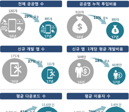 중앙행정기관, 지방자치단체, 공공기관에서 운영 중인 공공 앱 895개 중 510개는 유지, 215개는 개선, 147개는 폐기하는 것으로 결정됐다. 행정안전부(장관 김부겸)가 2017년 공공 앱(모바일 대민서비스 앱) 운영 현황(2017년 8월 31일 기준)을 조사해 성과 측정 후 기관별 이행계획을 반영하여 정비한 결과, ‘전국학원정보’, ‘청송관광’ 등 공공 앱 147개를 폐기하기로 결정했다. 이는 그간 공공 앱과 관련해...