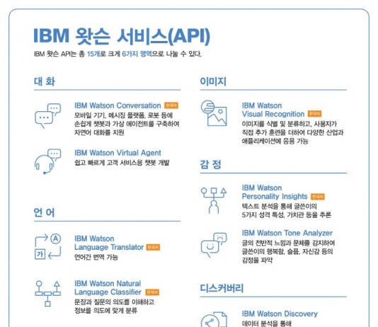 한국어 공부를 마친 IBM 왓슨이 마침내 돌아왔다. IBM 왓슨은 국내 인공지능 비즈니스 분야에서 자연어 이해, 대화, 언어 관련 서비스, 이미지 및 감정 분석이 가능한 8개 서비스에 대해 서비스를 제공한다는 계획이다. 한국IBM과 SK C&C는 지난해 협력 발표 이후 왓슨의 한국어 개발을 추진해 왔다. 한국IBM(대표 장화진) 6일, IBM클라우드를 통해 제공되는 왓슨의 한국어 서비스는...