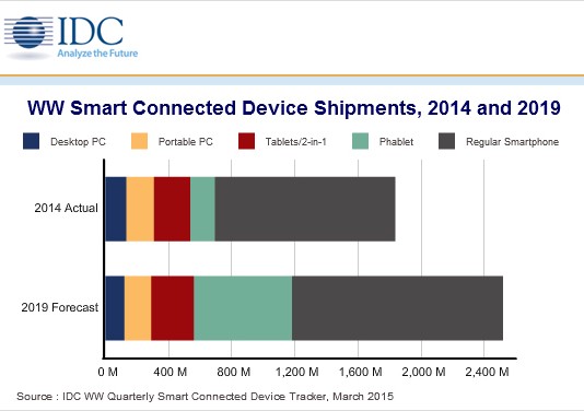 스마트폰과 태블릿, PC 등 세계 스마트 커넥티드 디바이스(Smart Connected Device, SDC) 시장이 지난해 18억대를 기록, 오는 2019년 25억대 규모에 이를 것으로 전망된다. IDC(www.idc.com)의 Worldwide Quarterly Smart Connected Device Tracker 최신 연구조사에 따르면, 이 기간동안, 전체 스마트 커넥티드 디바이스(SCD) 출하량의 상당부분을 스마트폰이 차지하고, 태블릿과 PC는 적은 비중에 그칠 전망이다.2010년만...
