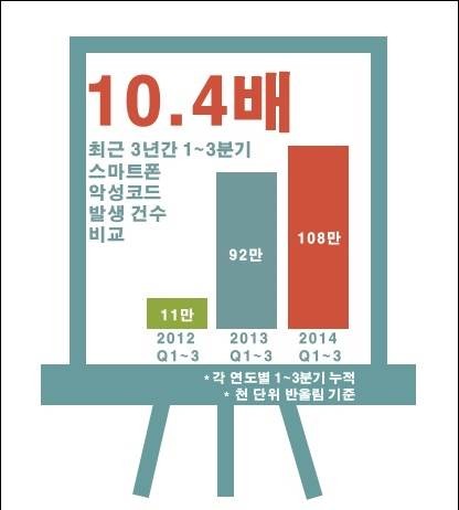 스마트폰 보급률 증가 및 모바일 금융거래가 보편화되면서 스마트폰에 저장된 개인정보와 금융정보를 탈취하기 위한 공격자들의 악성코드 배포가 폭발적으로 증가하고 있어 사용자의 각별한 주의가 요구된다.안랩(www.ahnlab.com)은 안드로이드 기반 스마트폰 사용자를 노리는 악성코드가 2014년 1~3분기 누적으로 총 107만 9,551개로 나타나 2년 전 동기간(11만 2,902개) 대비 10.4배 증가했다고 밝혔다. 이는 13년도 동기간(92만 2,707개)과 비교해도...