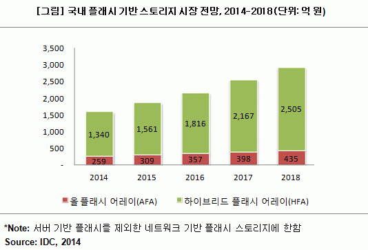 한국IDC가 최근 발표한 국내 플래시 기반 스토리지 시장 전망 보고서(Korea Flash-Based Storage 2014-2018 Forecast and Analysis, Doc #KR26071451)에 따르면, 올 플래시 어레이(AFA)와 하이브리드 플래시 어레이(HFA)를 모두 포함하는 네트워크 기반의 플래시 스토리지 시장이 올해 1,599억 원에 이를 것으로 예상됐다. 이는 전체 외장형 스토리지 시스템 시장의 36.7%에 해당한다. 그 중 올...