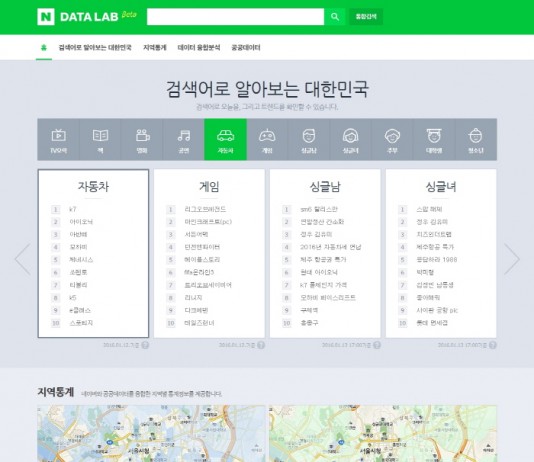 네이버가 10여 년간 축적된 데이터를 이용자들이 활용할 수 있도록 빅데이터 포털을 오픈했다.네이버는 14일 이용자들이 네이버 등 민간기업과 공공기관이 보유한 데이터를 활용할 수 있도록 하는 빅데이터 포털, ‘DATA LAB’(이하 데이터 랩, http://datalab.naver.com/)의 베타 버전을 오픈했다.네이버 데이터 랩의 핵심은 이용자들이 다양한 민간/공공 데이터를 한눈에 볼 수 있고, 더 나아가 이를 자신이...