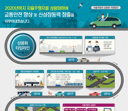 오는 2020년 쯤 우리나라에서도 자동차 스스로 부분적인 자율주행이 가능한 레벨3 수준의 자율주행차가 상용화될 것으로 보인다. 국토교통부는 6일 박근혜 대통령 주재로 열린 제3차 규제개혁장관회의에서 미래창조과학부·산업통상자원부 등 관계부처 합동으로 마련한 ‘자율주행차 상용화 지원 방안’을 발표했다. 방안은 자동차 선진국에 비해 다소 뒤떨어진 자율주행 기술개발을 촉진하는 한편 자율주행차의 조속한 상용화를 위해 규제 개선...