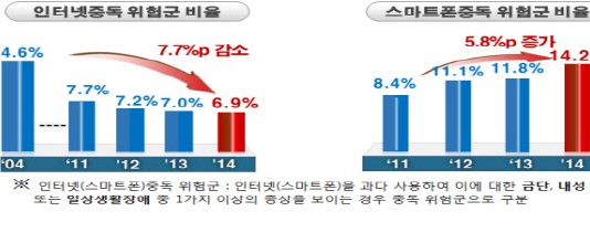 우리 국민의 인터넷중독 위험군 비율은 2004년 첫 조사 이후 현재까지 감소(2004년 14.6% → 2014년 6.9%)하고 있는 것으로 나타났다. 그러나 스마트폰중독 위험군 비율은 최근 지속적으로 증가(2011년 8.4% → 2014년 14.2%)하고 있어 민·관의 꾸준한 관심과 대책이 필요한 것으로 확인됐다. 정부는 13일 ‘2014년도 인터넷중독 실태조사 결과’ 발표와 함께, ‘2015년도 인터넷중독 예방 및...