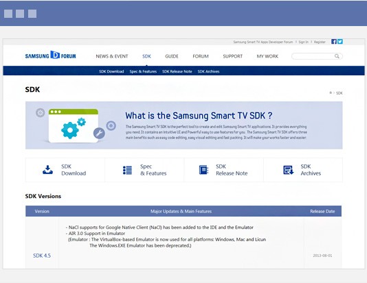 삼성전자가 스마트TV용 앱을 쉽게 제작할 수 있는 개발용 도구인 SDK(Software Develop Kit) 5.0을 새롭게 공개한다.이번에 공개될 SDK 5.0과 기존 SDK 4.5의 가장 큰 차이점은 삼성 스마트TV와 연동 될 수 있는 기기의 범위가 크게 확대됐다는 점으로 TV 앱을 이용해 조명, 에어컨, 냉장고 등의 가전기기 제어가 가능하다.특히, 이번 SDK 5.0에는...
