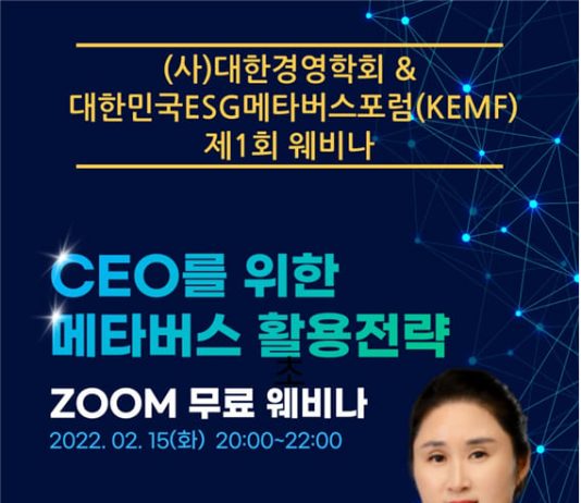 (사)대한경영학회(KAABA)와 대한민국ESG메타버스포럼(KEMF)은 오는 15일(화) 오후 8-10시에 'CEO를 위한 메타버스 활용전략'이라는 주제로 제1회 웨비나를 개최한다. 대한민국ESG메타버스포럼은 (주)한국디지털진흥원 김민경 대표를 초청해서 각 기관과 기업을 대표하는 CEO를 대상으로 메타버스 활용전략에 대해 '제1회 웨비나'를 무료로 진행할 예정이다. 김민경 대표는 메타버스에 대한 기업체 특강, 공무원 연수 등 다양한 교육과 컨설팅 경험을 갖고 있고, 온오프라인 영상촬영장비와 시설도...