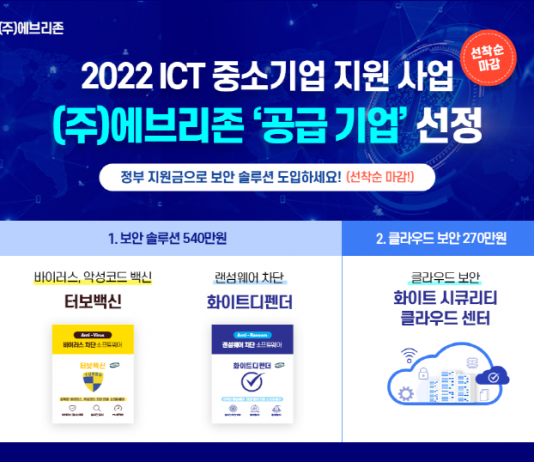 24년 전통 토종 백신회사 에브리존(대표이사 홍승균)이 ‘2022년 ICT 중소기업 정보보호 지원사업’에 보안솔루션과 클라우드 보안서비스 공급 기업으로 선정됐다.에브리존은 과학기술정보통신부와 한국인터넷진흥원(KISA)이 주관하는 보안솔루션 지원 사업을 통해 중소기업에 최대 540만원의 악성코드·랜섬웨어 소프트웨어를 지원한다.중소기업은 악성코드·랜섬웨어 대응을 위해 화이트디펜더, 터보백신, 화이트시큐리티센터를 도입할 수 있다. 자체 보안솔루션 운영이 어려운 중소기업의 경우 최대 270만원을 지원 받아 클라우드...