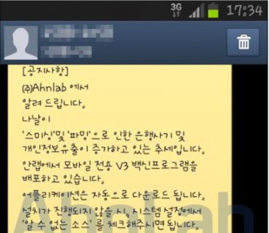 안랩 스마트폰 보안 앱인 ‘V3 모바일’ 설치 안내로 위장한 스미싱이 등장, 사용자의 주의가 요구된다. 안랩(www.ahnlab.com)은 최근 안랩의 모바일 보안 제품인 ‘V3 모바일’을 사칭한 악성 앱과, 해당 악성 앱의 설치를 유도하는 안랩 사칭 문자 메시지가 발견되어 사용자의 주의가 필요하다고 발표했다. 먼저, 이번에 발견된 안랩 사칭 문자 메시지는 ‘ ㈜Ahnlab에서 알려드립니다.’로 시작해 마치...