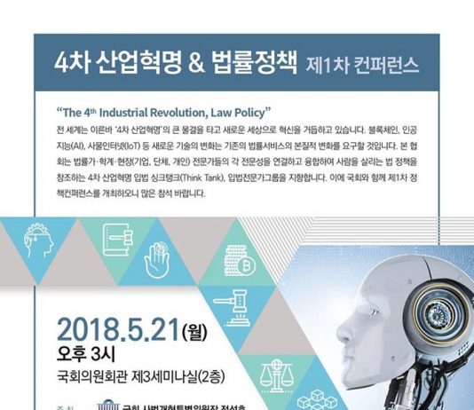 국내 첫 <2018 4차산업혁명 & 법률정책 컨퍼런스(The 4th Industrial Revolution & Law Policy)>가 5월 21일(월) 오후 3시 국회의원회관 제3세미나실에서 열린다.전 세계는 이른바 ‘4차 산업혁명’의 큰 물결을 타고 새로운 세상으로 혁신을 거듭하고 있는 가운데, 블록체인, 인공지능(AI), 사물인터넷(IoT) 등 새로운 기술의 변화는 기존 법률서비스의 본질적 변화를 요구할 것으로 보인다. 일례로 지난 3월...