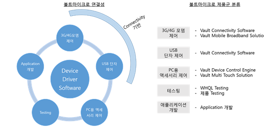 볼트마이크로(Vault Micro)는 2009년 설립된 연결성 기반 소프트웨어 전문 개발사이다. 이 회사는 기기를 제어하는 기기 드라이버 소프트웨어(Device Driver Software) 기술을 바탕으로 USB 단자를 통한 연결 및 미러링크(Mirror Link) 솔루션을 제공하고 있다. 또한 향후 사물 인터넷(Internet of Things; IoTs)의 핵심인 기기 연결성 기술의 잠재성을 가진 기업으로 판단된다. 볼트마이크로의 연결성 기반과 제품군 Source :...