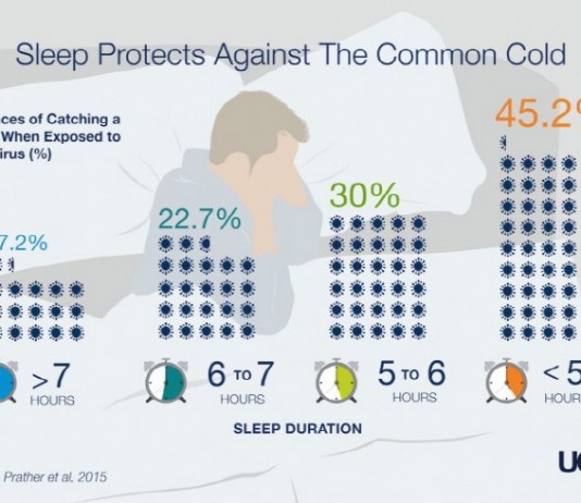 잠을 많이 자야 바이러스에 대항하는 면역체계의 능력이 높아져 건강하다는 연구결과가 나왔다. 미국 샌프란시스코 대학(UCSF) 의과대학 정신의학전문의 애릭 프래서(Aric A. Prather) 박사는 수면시간이 하루 6시간 이하인 사람은 7시간 이상인 사람에 비해 감기에 걸릴 가능성이 4.2배 이상 높다는 연구결과를 발표했다(Prather et al., SLEEP, 31 Aug 2015). 수면시간이 하루 5시간 이하인 사람은 감기 바이러스에...