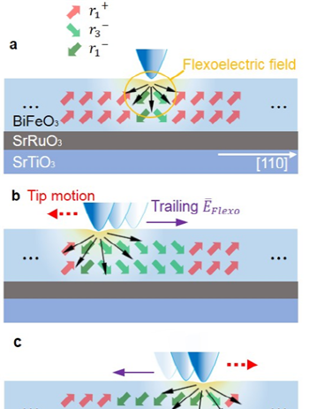 나노미터 단위에서는 변전효과가 압전효과보다 더 커질 수 있다는 점에 착안해 강유전체인 비스무스산화철(BiFeO3)을 실험에 적용했다. 비스무스산화철은 8가지 방향의 전기적 분극을 가지면서 동시에 자기적 성질과 탄성도를 모두 지녀 최근 차세대 메모리 소자의 신소재로 관심 받고 있다.공동 연구진은 먼저 비스무스산화철을 나노박막 형태로 증착한 뒤, 주사탐침현미경(Scanning Probe Microscope, SPM)의 탐침(Tip)으로 나노박막에 힘을 가하며 박막 내부의 분극 변화를 관찰했다. 그 결과, 아주 얇고 뾰족한 탐침으로 나노박막을 누르며 움직이면 탐침의 이동방향에 따라 비스무스산화철 내부의 분극 방향(180。, 71。)을 선택적으로 제어할 수 있다는 흥미로운 사실을 발견했다.