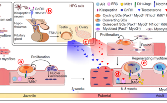 국내 연구진이 성체 근육 줄기세포의 형성 과정을 세계 최초로 규명했다. 따라서 근육 질환에 대한 치료법 개발 가능성을 열었다. 성체 근육 줄기세포는 골격근섬유 주변에 존재하는 단핵세포로, 근육 재생을 담당하는 성체 줄기세포다. 서울대학교 자연대 공영윤 교수팀은 사춘기에 분비된 성호르몬이 Mib1-Notch 신호를 조절하여 성체 근육 줄기세포를 형성시킨다는 연구결과를 국제학술지인 네이쳐 셀바이올로지(Nature Cell Biology,...