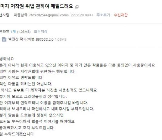 저작권 침해 관련 메일을 통해 악성코드가 유포되고 있어 사용자들의 주의가 각별히 필요하다. 이메일은 '이미지 저작권 위법 관하여 메일드려요'라는 제목으로 유포되고 있다. 또한 보안 프로그램을 우회하기 위해 비밀번호가 설정 된 압축파일이 첨부되어 있다. 압축 파일 내에는 한글 아이콘을 위장한 실행파일과 이미지 파일이 포함되어 있다. 해당 파일을 사용자가 실행하면, LockBit 랜섬웨어가 실행되며 사용자 PC가 감염된다. 이는 기존에 유포하던 LockBit 랜섬웨어와 확장자명, 랜섬노트 등 주요 특징들이 같다. 비너스락커(VenusLocker) 조직은 지속적으로 저작권 위반, 입사지원서 등 키워드를 이용한 피싱메일을 통해 랜섬웨어를 유포 중에 있다. 에브리존 김준영 팀장은 “랜섬웨어 유포자들은 컴퓨터에 잠입해 내부문서나...