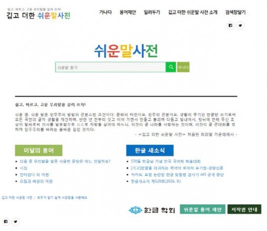 한글학회(회장 권재일)는 1967년부터 만들어온 ‘깁고 더한 쉬운말 사전’을 전자사전으로 다시 편찬해 오는 10월 9일, 570돌을 맞는 한글날을 기념해 공개 한다고 밝혔다.이번에 공개하는 ‘쉬운말 전자사전(www.hanmal.kr)’은 한글 학회는 1967년 ‘쉬운말 사전’을 처음 펴낸 뒤, 1984년 ‘고치고 더한 쉬운말 사전’에 이어, 1999년 ‘깁고 더한 쉬운말 사전’을 이번 570돌 한글날을 맞아 이를 누리집에서...