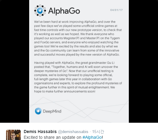 최근 인터넷 바둑 사이트 등에서 중국의 커제를 비롯해 세계 최고의 기사들을 연거푸 격파하면서 바둑계를 뒤흔든 미스터리 바둑기사 ‘매지스터’와 ‘마스터’가 구글 디마인드 알파고의 업데이트 버전'인 것으로 밝혀졌다.지난해 12월 29일부터 31일까지 한국 인터넷 바둑 사이트 ‘타이젬’에서 매지스터(Magister)라는 계정이 등장해 세계 최강 바둑기사인 중국의 커제(19세)를 비롯해 국내 랭킹 1위 박정환 9단 등과...