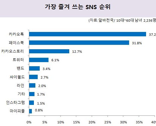 스마트폰 사용자 4000만 시대의 SNS(social network service) 중 가장 많이 쓰는 SNS로 ‘카카오톡’을 꼽았다.알바천국(www.alba.co.kr)이 전국 10대에서 60대까지 SNS 사용자 2,236명을 대상으로 조사한 바에 따르면, 이 중 가장 많이 쓰는 SNS는 ‘카카오톡’으로 나타났으며 각 나이대별로 선호하는 유형에 차이가 있는 것으로 드러났다.먼저 가장 즐겨 쓰는 SNS 1위는 무료 메신저 서비스...