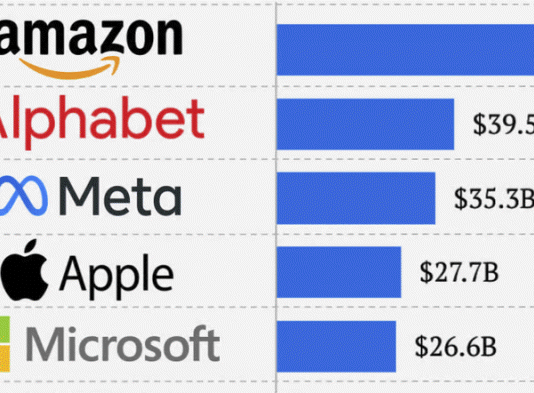 아마존, 구글, 메타, 애플, 마이크로소프트 등 거대 기술 기업들은 연구개발에 막대한 자금을 투자하고 있다. 이 5개 기업의 연구개발비 합계는 한국의 연구개발비 총액(GERD)을 크게 웃도는 것으로 나타났다.2023년 12월 과학기술정보통신부 발표에 따르면 2022년도 한국의 기업, 비영리단체, 공공기관, 대학 등 연구개발비 총액은 112조 6,460억 원(약 838억 5000만 달러)이다. 위 그래프는 미국 국립과학재단(National Science...