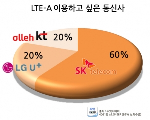 LTE-A 출시 한 달째 접어들면서 가입자 유치 경쟁이 치열하게 벌어지고 있다.모바일 설문조사 두잇서베이(www.dooit.co.kr)가 7월 23일부터 24일까지 4061명을 대상으로 진행한 ‘LTE-A 이용 의향 설문’ 결과 SKT를 통해 LTE-A를 이용하겠다는 응답자가 59.8%로 매우 높게 나타났다.전체 응답자 중 LTE-A를 사용할 의향이 있다고 대답한 응답자(61.7%, 2507명) 가운데 59.8%가 SK텔레콤을 통해 이용할 의향을 밝혀 다른...