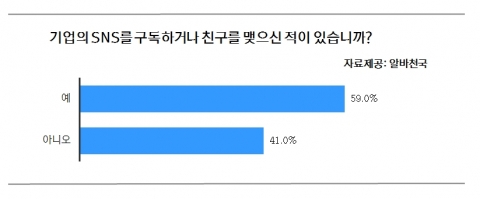 국내 스마트폰 가입자수가 내달 4천만 돌파를 앞둔 가운데 SNS 이용자 10명 중 6명은 기업 SNS를 구독 중이며, 1인당 4.4개의 기업과 친구를 맺은 것으로 나타났다.아르바이트 전문포털 알바천국(www.alba.co.kr)이 10대에서 40대까지 구직자 1,483명을 대상으로 ‘SNS 이용 행태와 활용 현황’을 조사한 결과, SNS 이용자 중 59%가 ‘기업계정의 페이스북, 카카오스토리 등과 친구를 맺거나...