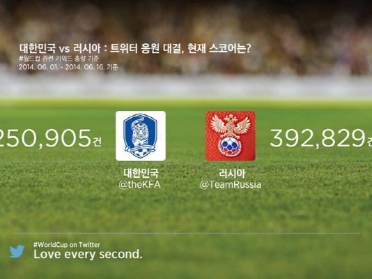 트위터 코리아가 SBS와 함께 브라질 월드컵 첫 경기 러시아전에 나서는 태극전사들의 승리를 염원하며 17일부터 ‘해시태그 응원 대결’이벤트를 시작한다.트위터 코리아는 월드컵 분위기가 본격적으로 무르익기 시작한 6월 1일부터 16일까지 우리나라와 러시아의 월드컵 트윗량을 집계한 결과, 우리나라가 25만905건으로 러시아 39만2829건의 64% 수준에 그치고 있는 것으로 나타나 SBS와 함께 전 국민적인 관심을...